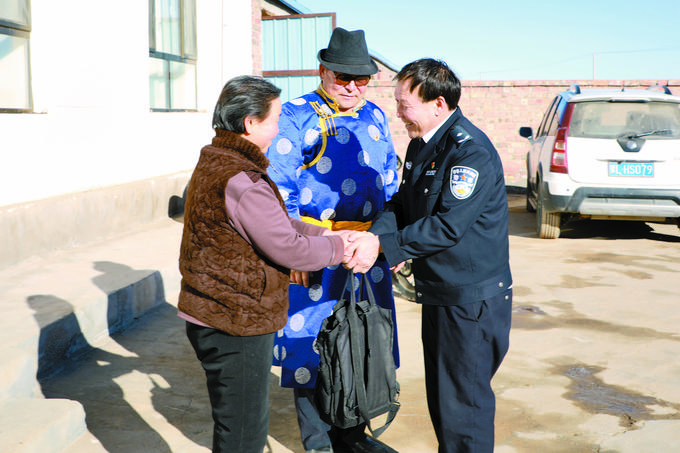 乌拉特后旗公安局潮格温都尔镇派出所教导员宝音德力格尔到辖区牧户家走访。吕淼 摄(资料图片)