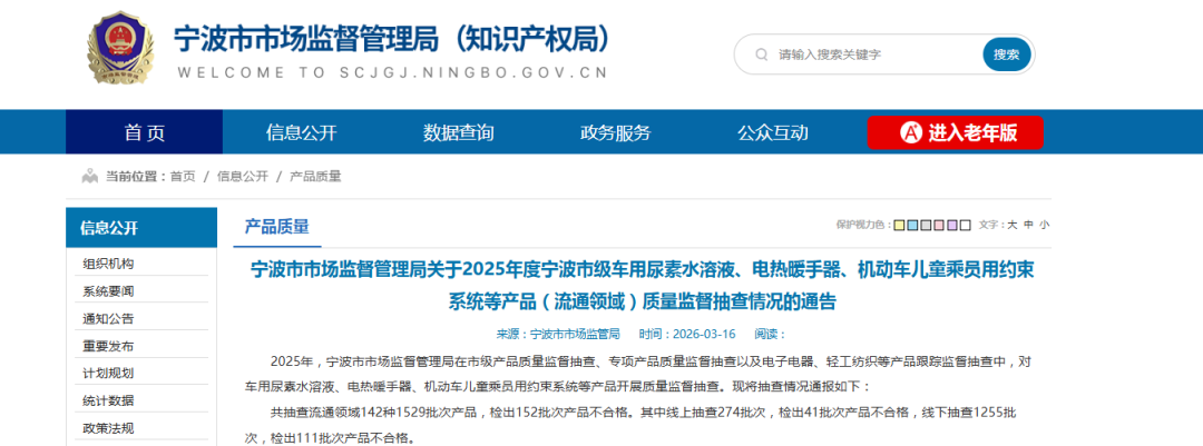 近日,宁波市市场监督管理局网站发布2025年度宁波市级车用尿素水溶液、电热暖手器、机动车儿童乘员用约束系统等产品(流通领域)质量监督抽查情况通告。