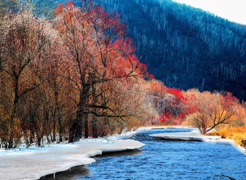 此时的阿尔山,藏着别处难寻的春日绝色。红毛柳迎来最佳观赏期,河畔枝头绯红似火,如丹霞落岸,与皑皑白雪、半融冰河相映成趣,艳红衬素白,分外动人。晨雾漫过河岸,红柳轻舞摇曳,将早春的浪漫写到极致。