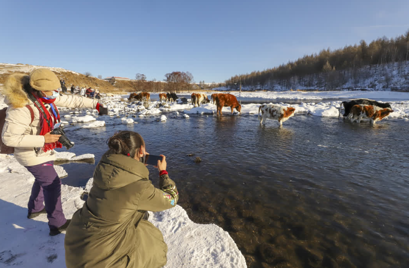 不冻河与翡翠河,更是三月阿尔山的点睛之笔。地热滋养的河水终年不冻,清晨时分雾气缭绕,宛若仙境;碧绿澄澈的水面如翡翠镶嵌在雪原之上,牛群悠然饮水漫步,勾勒出治愈又灵动的画面。漫步河畔,可沉浸式感受冰雪未消、春意已至的奇幻景致。