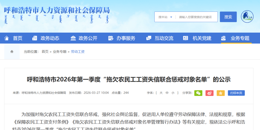为加强对拖欠农民工工资失信联合惩戒,强化社会舆论监督,促进用人单位遵守劳动保障法律、法规和规章,根据《保障农民工工资支付条例》《拖欠农民工工资失信联合惩戒对象名单管理暂行办法》等有关规定,现依法公示呼和浩特市2026年第一季度“拖欠农民工工资失信联合惩戒对象名单”。