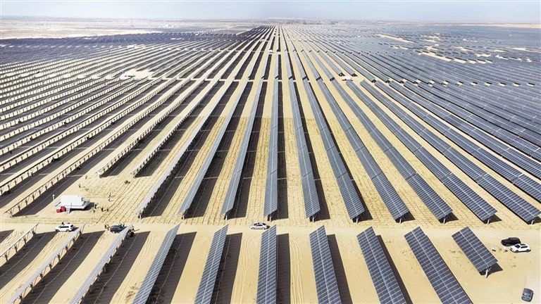 4月8日,在巴彦淖尔市乌拉特前旗苏计沙地200万千瓦光伏治沙区,工人们正在铺设草方格。该项目采用“光草药”立体开发模式,在光伏阵列下方种植耐旱药材,形成“板上发电、板间固沙、板下育药”的生态产业链。该项目首次将柔性支架光伏技术应用于沙地场景,为全国首例,年发电量可达29.6亿度,相当于节约标准煤91万吨。草原云·内蒙古新闻网记者 薛来 摄