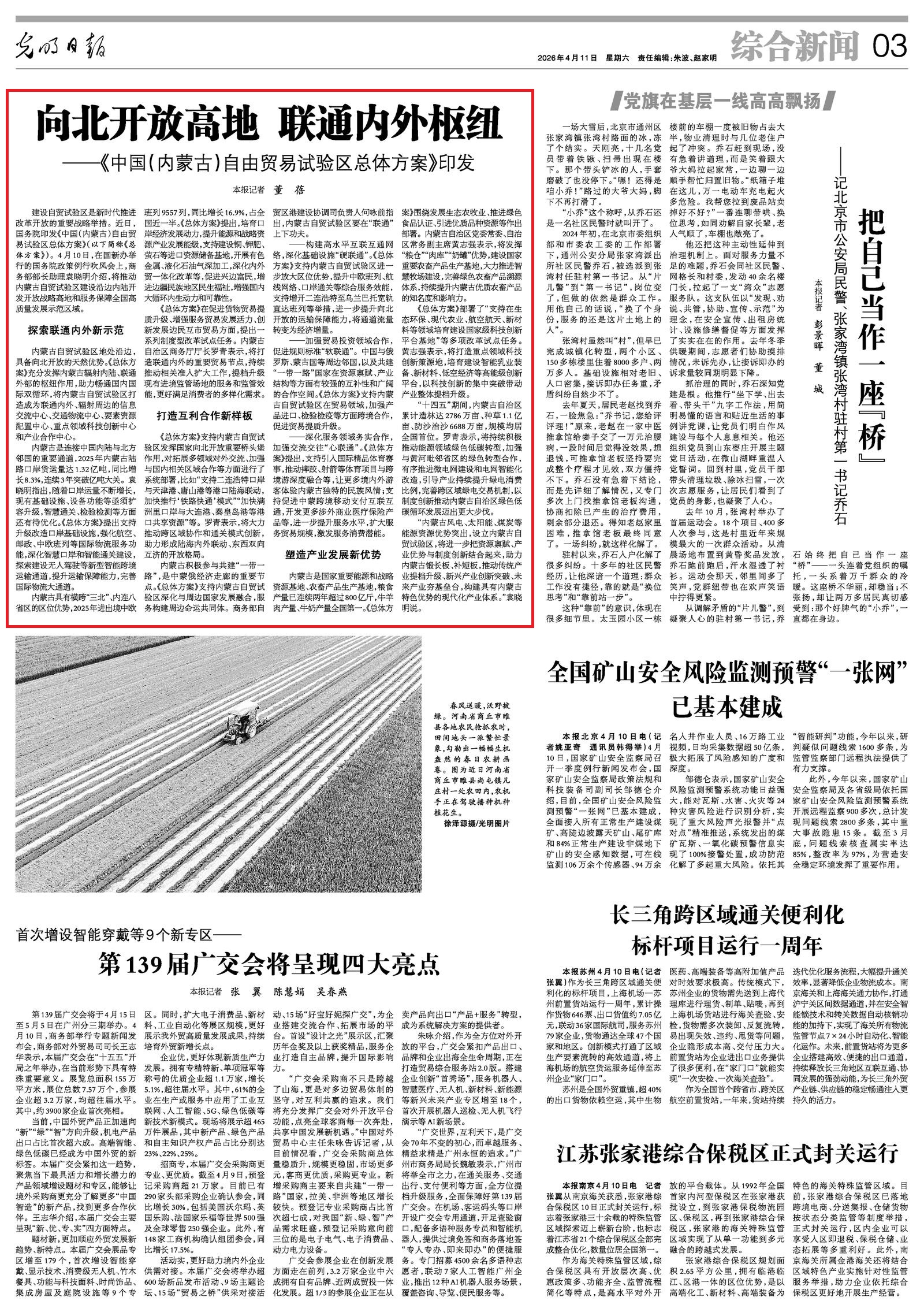 2026年4月11日《光明日报》3版刊发题为《向北开放高地 联通内外枢纽——<中国(内蒙古)自由贸易试验区总体方案>印发》的文章,报道了近日,国务院印发《中国(内蒙古)自由贸易试验区总体方案》。4月10日,在国新办举行的国务院政策例行吹风会上,商务部部长助理袁晓明介绍,将推动内蒙古自贸试验区建设沿边内陆开发开放战略高地和服务保障全国高质量发展示范区域。