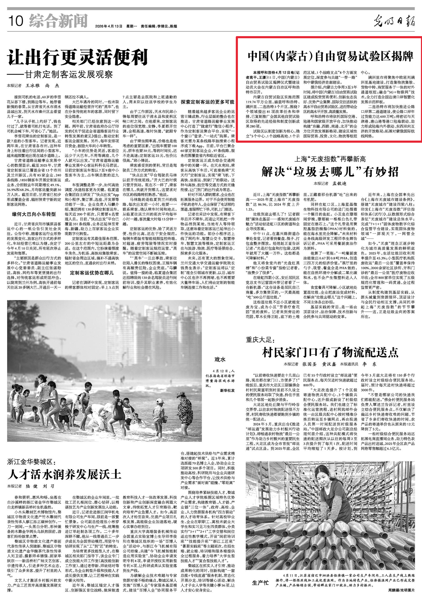 2026年4月13日,《光明日报》10版刊发题为《中国(内蒙古)自由贸易试验区揭牌》的文章,报道了11日,中国(内蒙古)自由贸易试验区揭牌仪式暨建设动员大会在内蒙古自治区呼和浩特市召开。