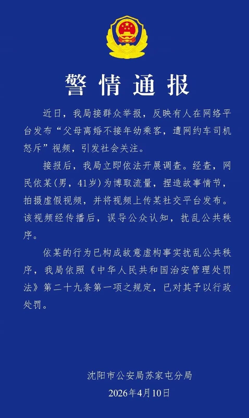 针对网传“父母离婚不接年幼乘客,遭网约车司机怒斥”的视频,4月10日晚,辽宁省沈阳市公安局苏家屯分局发布警情通报,具体内容如下:
