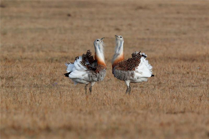 两只雄性大鸨斗舞争夺配偶。