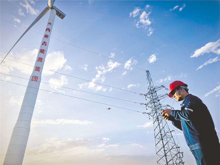 4月16日,在位于阿拉善盟阿拉善右旗阿拉腾敖包镇的内蒙古能源集团巴日斯风电场,工作人员正通过无人机对输电线路与风机设备进行巡检作业,为迎峰度夏期间电力可靠供应筑牢安全根基。草原云·内蒙古新闻网记者 怀特乌勒斯 摄