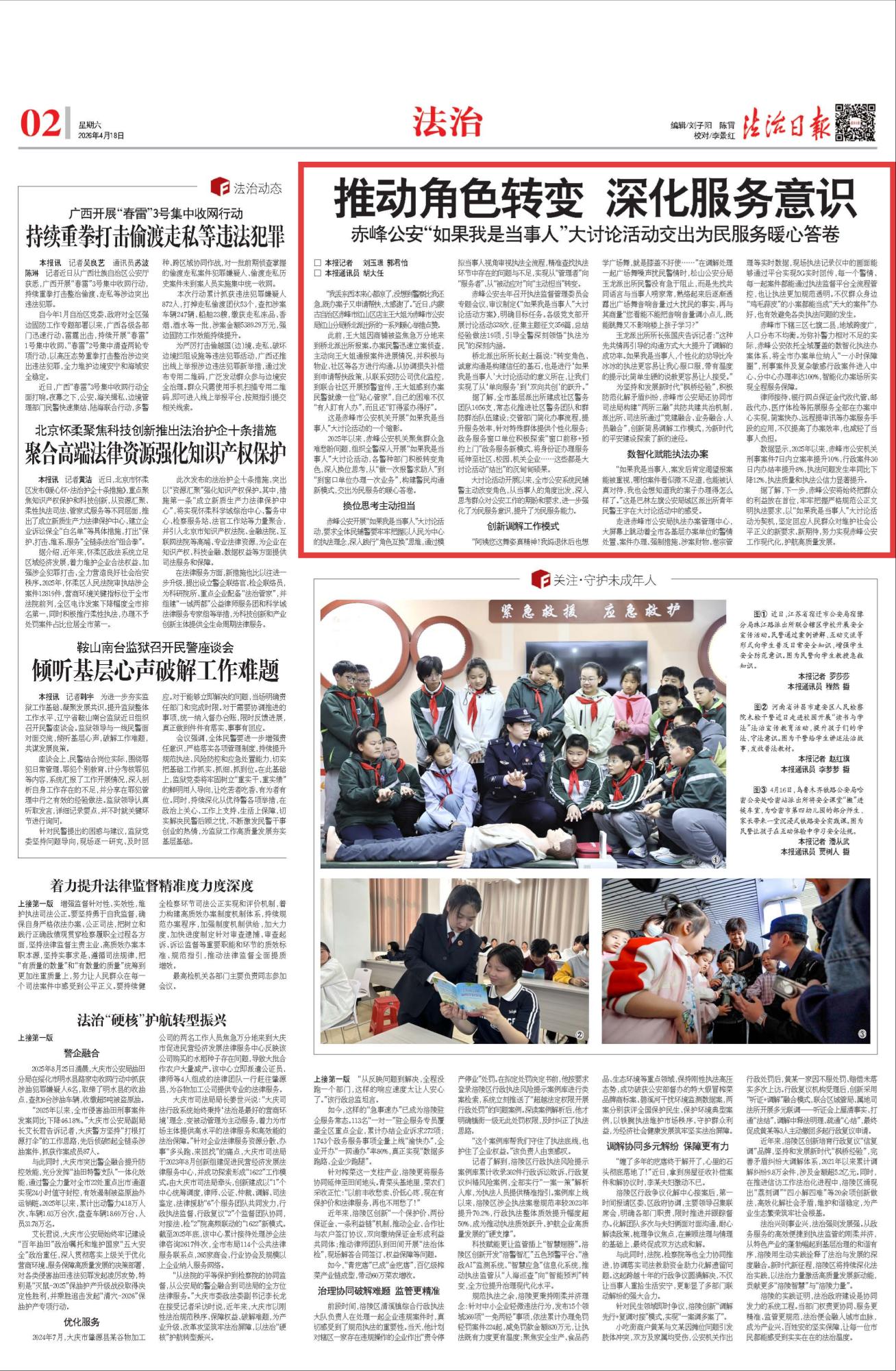 2026年4月18日,《法治日报》第2版刊发题为《推动角色转变 深化服务意识 赤峰公安“如果我是当事人”大讨论活动交出为民服务暖心答卷》的文章,报道了内蒙古赤峰公安机关聚焦群众急难愁盼问题,开展“如果我是当事人”大讨论活动,各警种部门积极转变角色从“做一次报警求助人”到“到窗口单位办理一次业务”,构建警民沟通新模式,交出为民服务的暖心答卷。