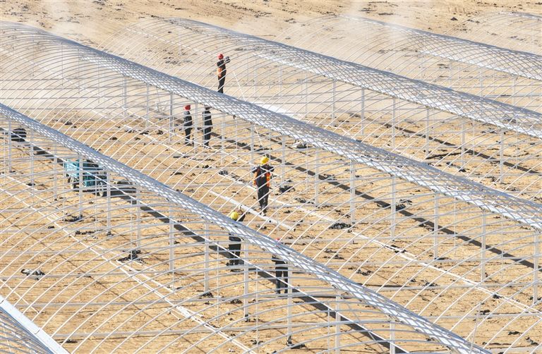 近日,在巴彦淖尔市乌拉特前旗“佘太红”设施农业基地建设现场,工人们正在搭建温室大棚钢架。该地块曾是长期荒废、无人耕种的盐碱地,基地通过“科技改良+设施农业”模式,重点种植番茄、薄皮甜瓜等高附加值农产品。基地建成后,将为当地提供2000多个就业岗位,预计带动就业增收约3300万元。草原云·内蒙古新闻网记者 薛来 摄