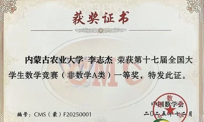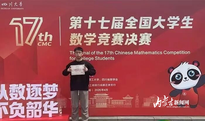 本网讯(草原云·内蒙古新闻网记者 郝少英) 4月19日,第十七届全国大学生数学竞赛决赛在四川大学落下帷幕,内蒙古农业大学生命科学学院生物技术专业2023级本科生李志杰凭借出色表现荣获此次竞赛(非数学A类)全国一等奖,全区唯一。