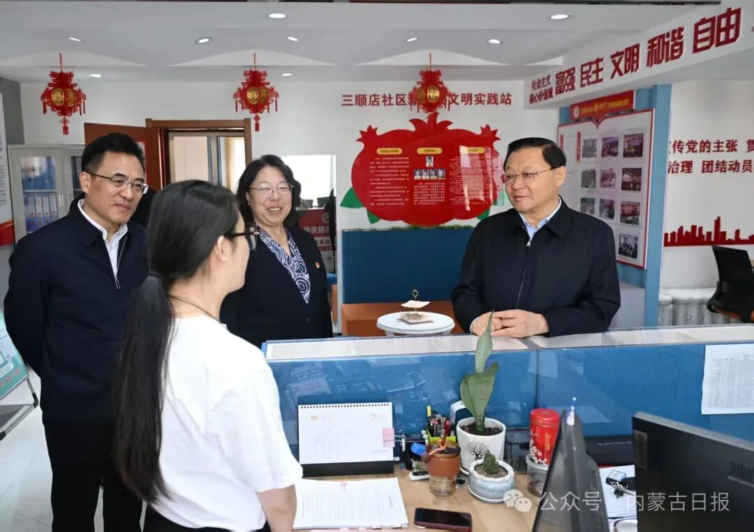 4月21日,自治区党委书记、人大常委会主任王伟中走进回民区通道街街道三顺店社区党群服务中心,仔细查看民情工作台账,与基层干部群众深入交流。草原云·内蒙古新闻网记者 马建兵 摄