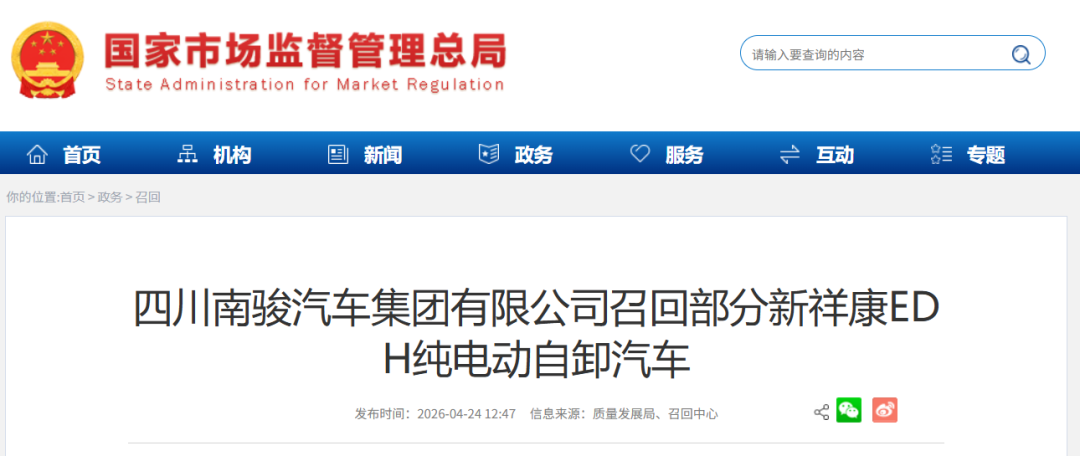 召回编号S2026M0047V:自即日起,召回2021年12月1日至2025年7月31日期间生产的部分新祥康EDH纯电动自卸汽车,共计89辆。